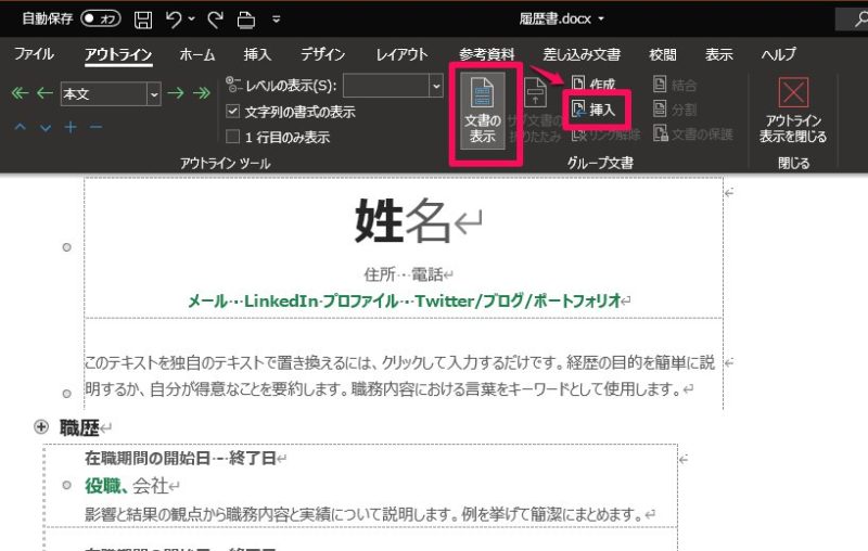 アウトライン表示→「グループ文書」→「文書の表示」→「挿入」をクリック。
