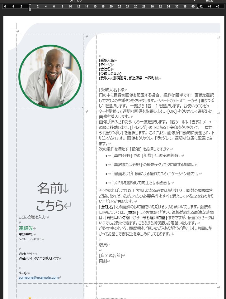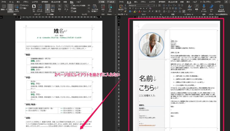 例えば下の画像で、左の履歴書の2ページ目に、右側のカバーレターを挿入するケースを見てみます。