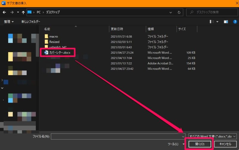ファイル選択ダイアログがでますので、挿入したいWordファイルを選択します。