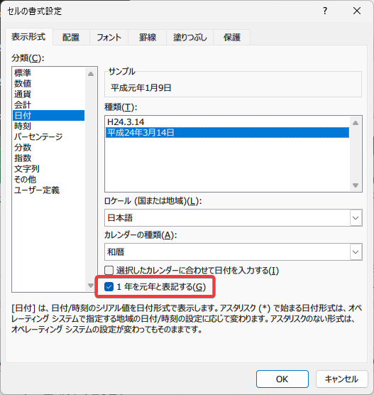 「セルの書式設定」が開きます。「日付」→「ロケール:日本語」→「カレンダーの種類:和暦」と選択し、「1年を元年と表記する」にチェックを入れます。
