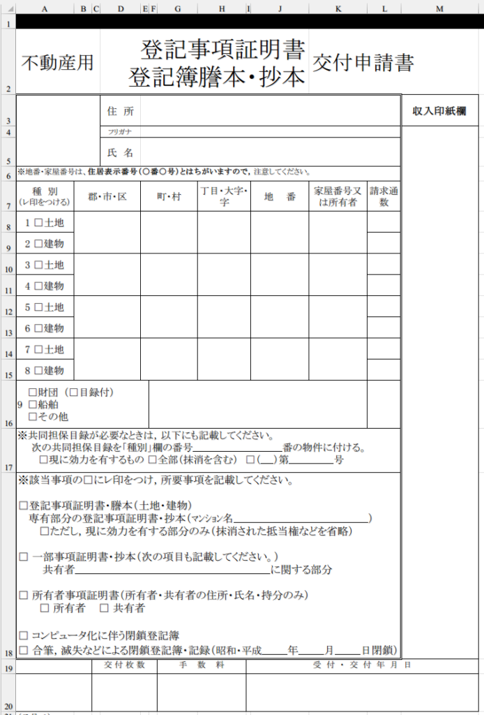 タイトルの通り、不動産登記事項証明書交付申請書のExcelテンプレートを作成してみました。