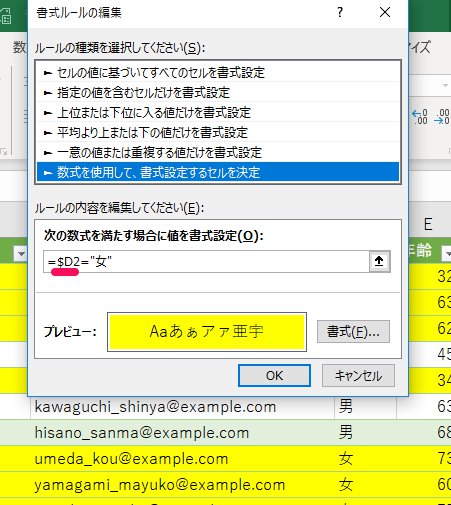 例えば性別が「女」となっている顧客のレコード(行)自体を塗りつぶしたい場合、数式の設定は以下の通りとなります。